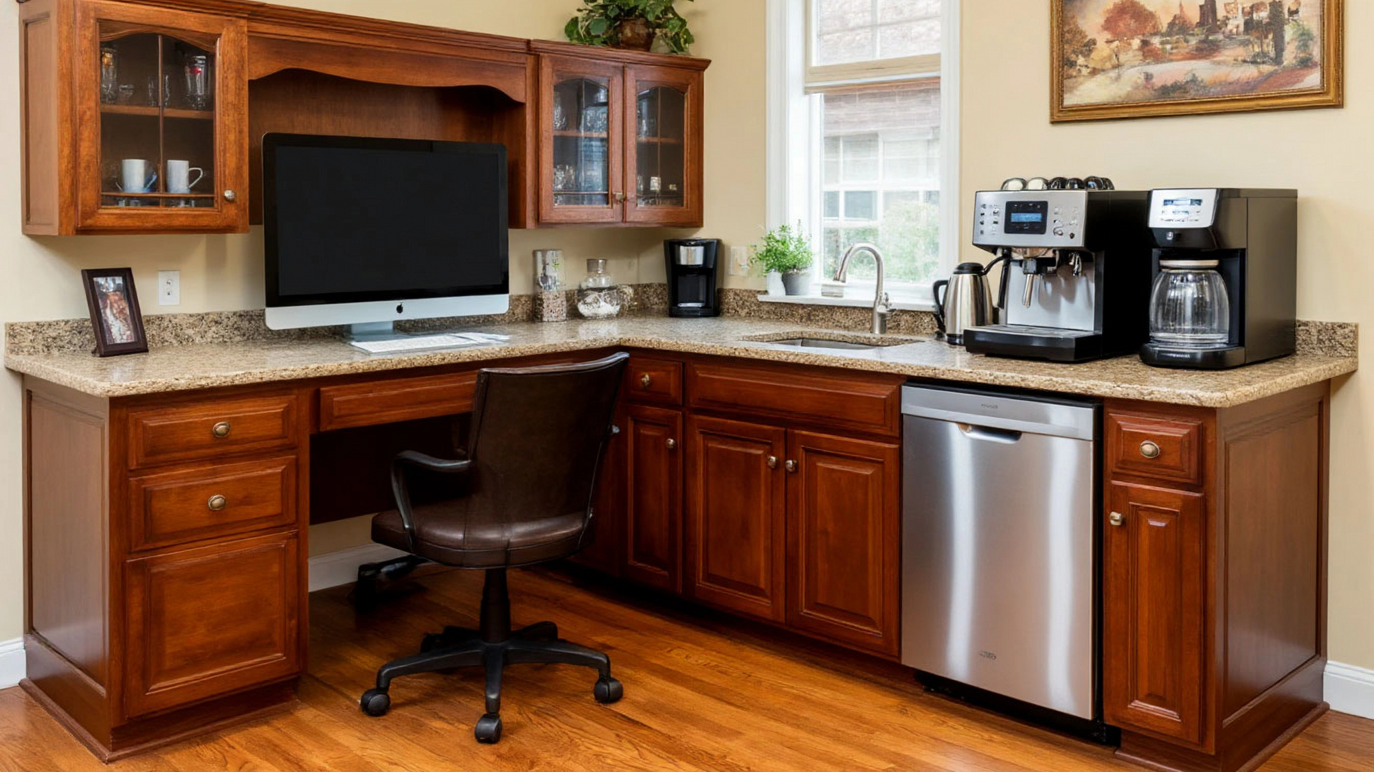 Стол выполнен в элегантном древесном цвете, который добавляет тепла и уюта вашему интерьеру. Его стильный и современный дизайн позволит легко вписать его в любое помещение, будь то домашний офис, креативное пространство или малый бизнес. Встроенные элементы, такие как холодильник и раковина, позволяют вам всегда иметь под рукой необходимые напитки и закуски. Благодаря этому вы сможете сосредоточиться на работе, не отвлекаясь на поиски кофе или воды. Кофемашина, встроенная в конструкцию стола, обеспечит бодрящий кофе в любое время дня, позволяя вам поддерживать высокий уровень продуктивности.