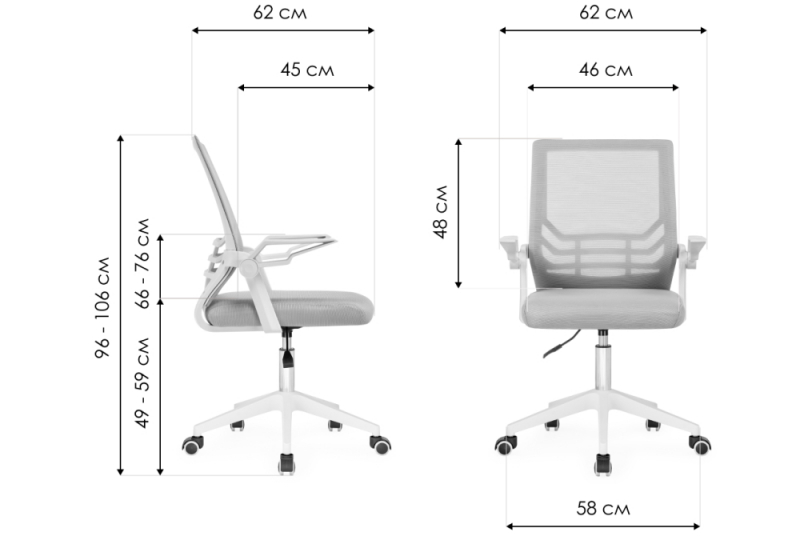 Высота подлокотников: 66 - 76 см. Диаметр крестовины: 58 см.